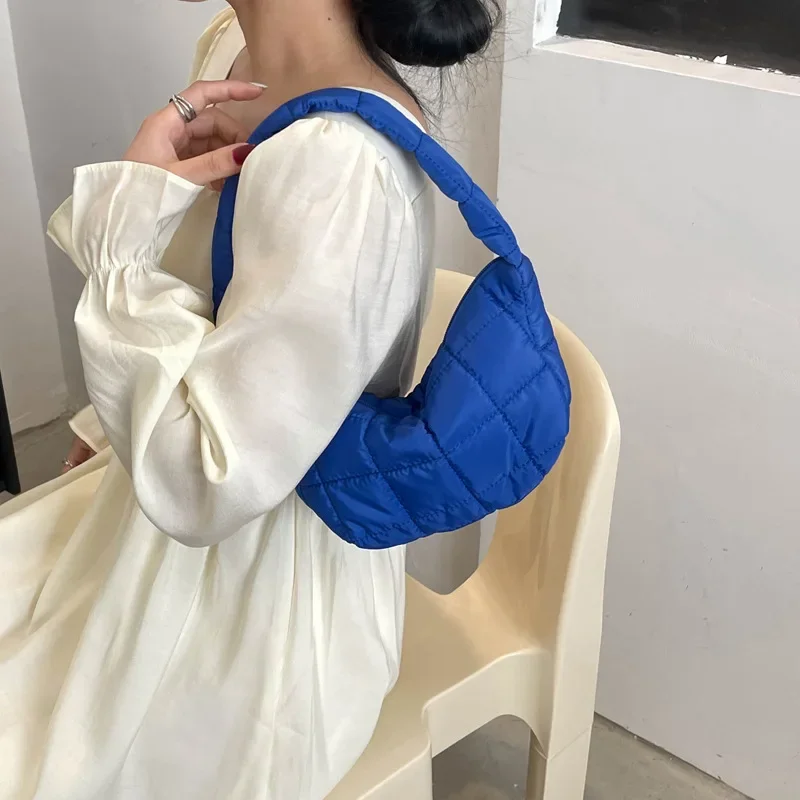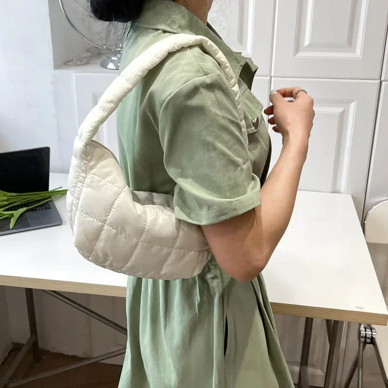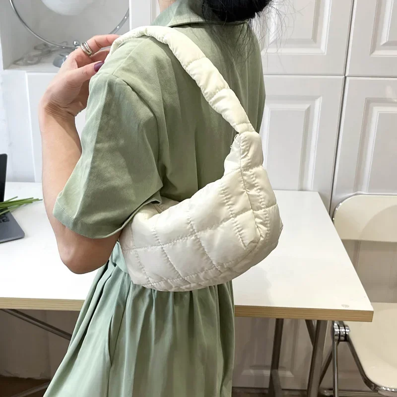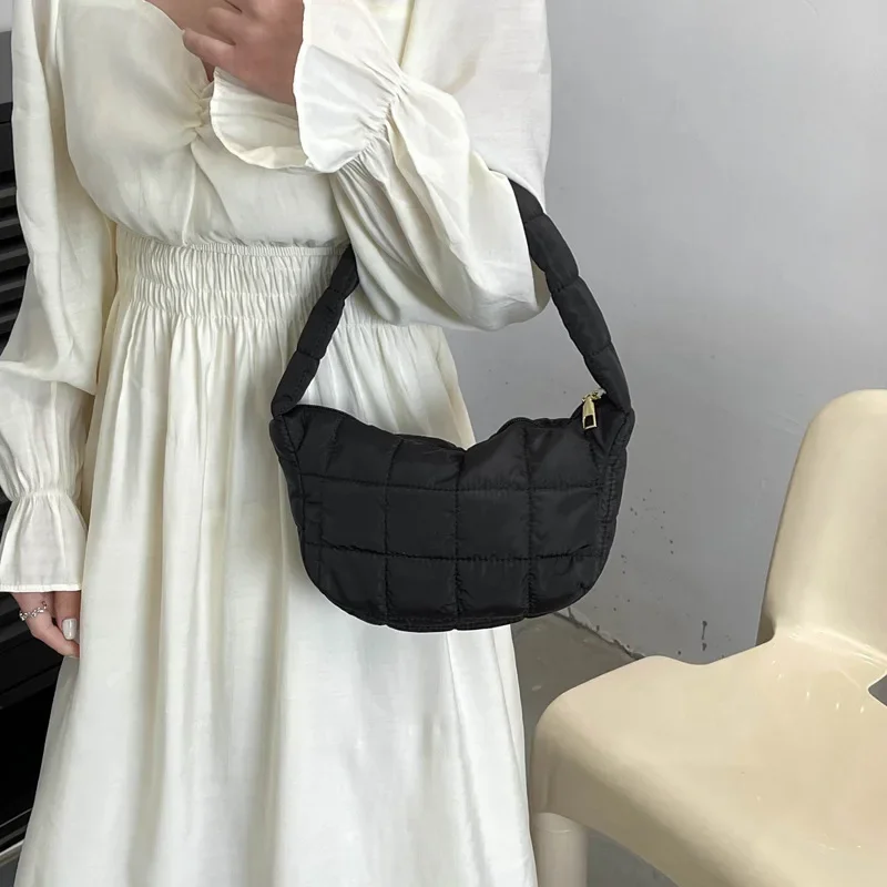 Puffer Quilted Shoulder Bag Plaid Embroidery Underarm Tote Purse Retro Padded Hobo Handbag for Women Daily Use Work Travel Party